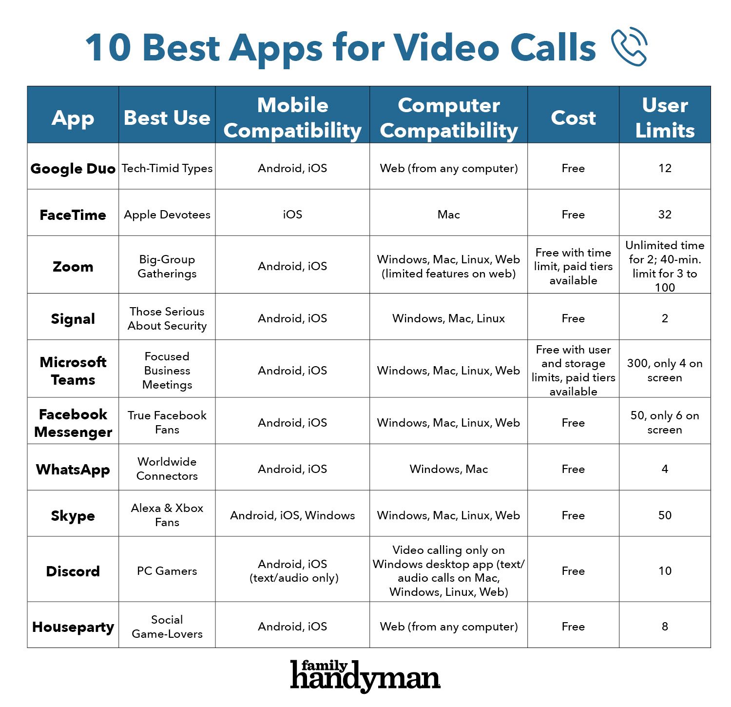 Whether you’re after clarity on a work project or simply want to connect with your people, video calling apps deliver the virtual face time you seek. We rounded up 10 popular options, including a handy table outlining the benefits and limitations of each. They’re all free to some degree, so try out a few that look like winners to help zero in on the best video calling option for you.