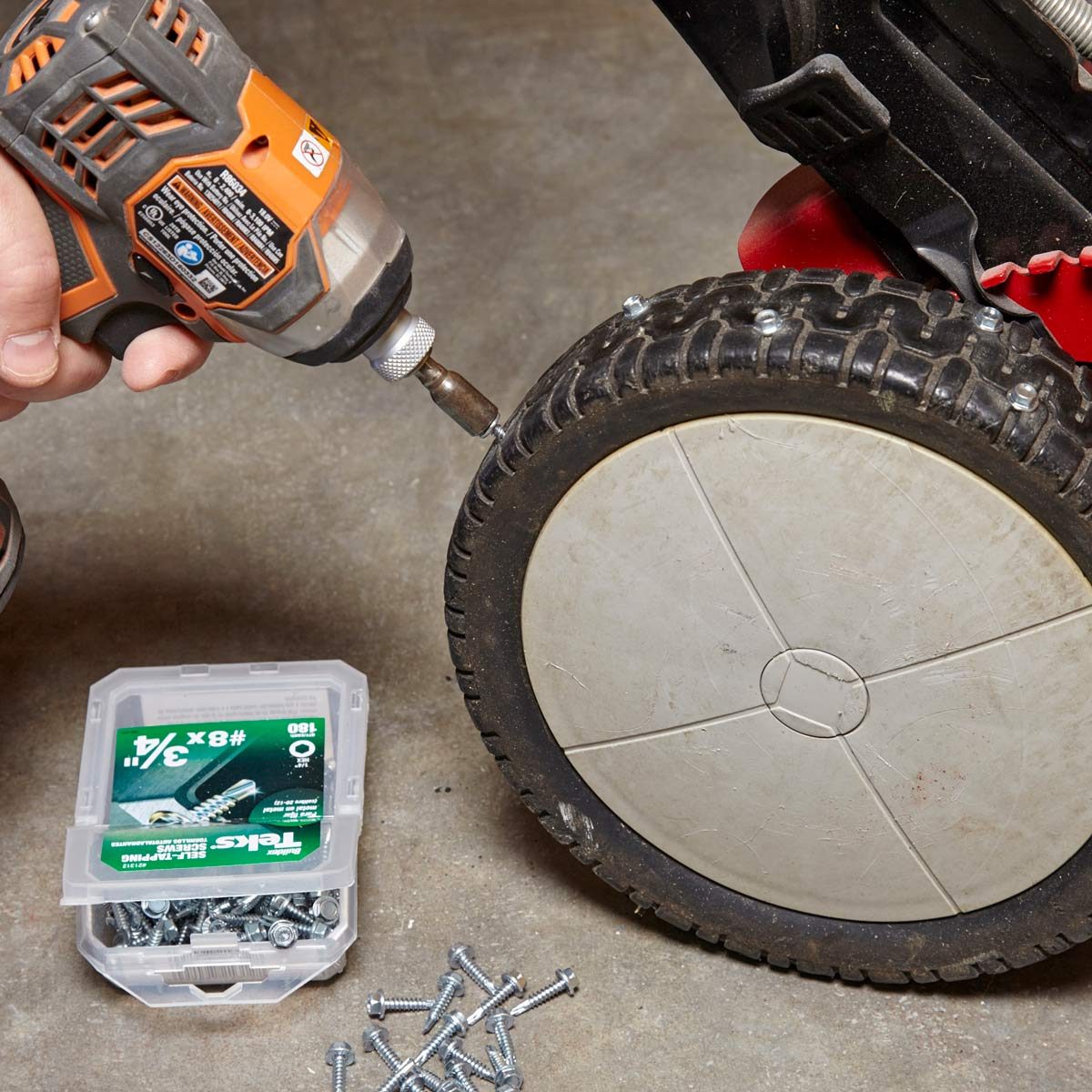 The drive wheels on my self-propelled lawn mower would sometimes spin on hills, especially when the grass was damp. To improve the traction, I drove a few self-tapping sheet metal screws with hex-shaped heads into the wheels. Now the tires perform like those knobby tires on off-road vehicles. — Gaylord Gwisdalla
