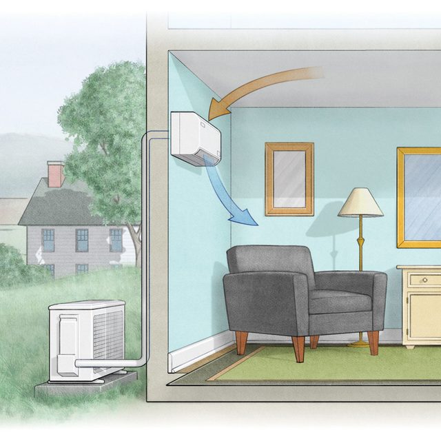 Long popular in Europe and Japan, a mini-split system air conditioner (sometimes called ductless AC) is a hybrid of central air and a window unit. A small condenser sits outside and connects through a conduit to an inside evaporator mounted high on the wall or ceiling. Mini-split AC systems don’t require ductwork and can be run to one or more rooms. Their small size, quiet operation and individual zoning let you cool only the room you’re using, which can save energy and money.