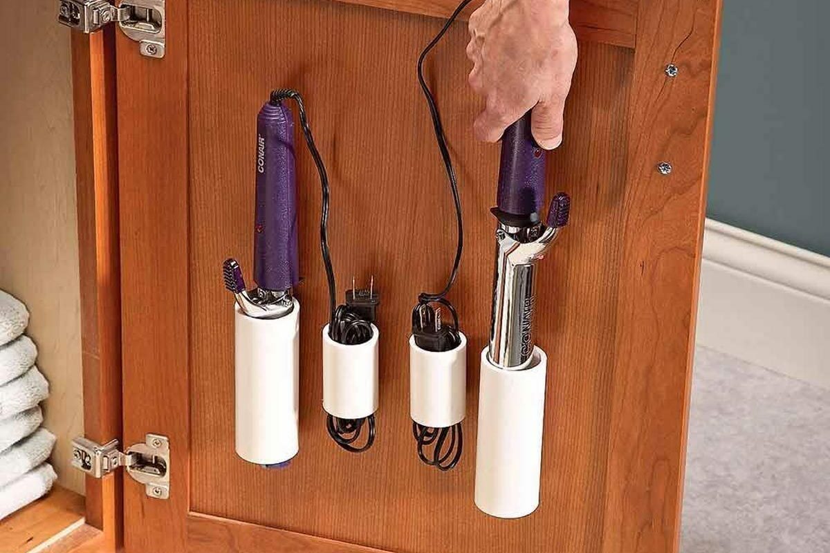 Hate the messy look of curling irons lying on the vanity or the toilet tank? Here’s a tip for you. Use hook-and-loop tape to attach 5-in. lengths of 2-in.- diameter PVC pipe to the vanity door to hold the curling irons. Do the same thing with 3-in. pieces of 1-1/2-in.-diameter pipe to hold the cords. Just measure your curling irons to see how long your “holsters” need to be. Let your curling irons cool before you stow them away.