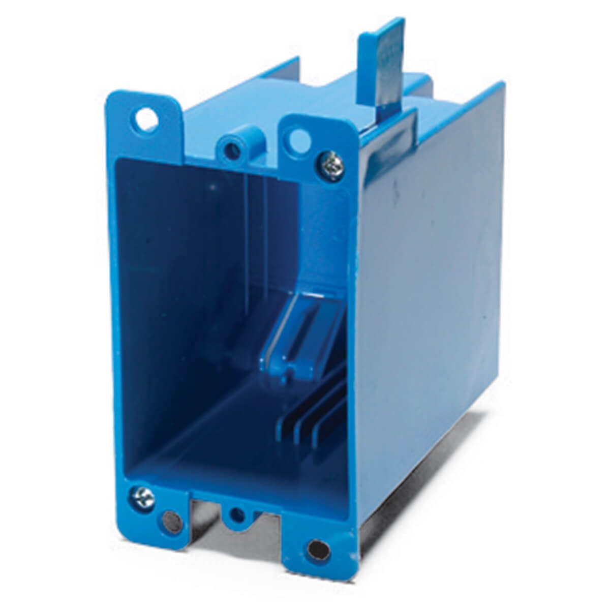 Remodeling boxes can be metal or plastic. Most mount to the drywall using some sort of mechanism that pinches the box between the flanges on the front and ears that flip down or expand on the back.