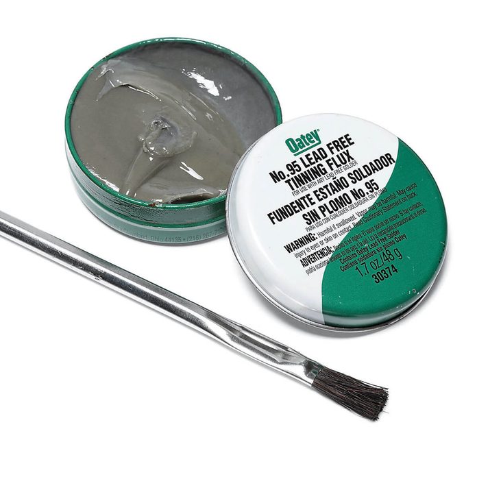 Flux is part of a dynamic duo of products that allows you to connect copper pipe and fittings by “sweating” or “soldering.” Flux is an acidic paste that comes in a little round tin. The soldering process begins by cleaning the inside (or female portion) of the fitting and the outside (or male portion) of the pipe with a stiff brush and fine grit emery paper.