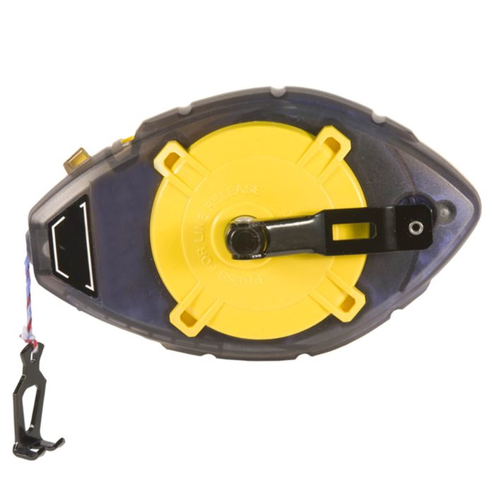 Powdered chalk is available in a variety of colors, each with its own special “talent.” Blue is a good all-purpose chalk with good visibility on concrete and plywood; red chalk is more permanent and is slower to wash or rub off; white chalk is non-staining, thus good for interior work; and bright orange, yellow and green chalk can be more easily seen in low-light areas. Most chalk boxes—because of their teardrop shape—can also double as plumb bobs for establishing vertical lines.