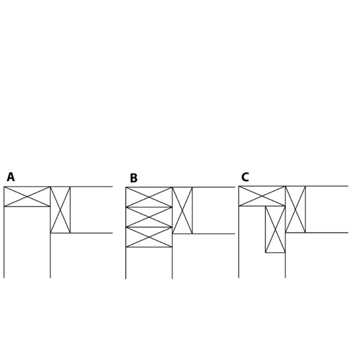 Since three pictures are worth 3,000 words, let’s take a look at three diagrams. Before we start, bear in mind the whole “corner” scenario revolves around providing a proper nailing surface or backing for drywall in the corner. You can see in illustration A that there’s nothing to secure the drywall to on one of the walls. This type of corner is called a “Tick off the drywaller corner.” In the “Traditional corner” (B) you can see there’s adequate backing for drywall on both walls. The downside is that it requires 4 studs (or 3 studs with scrap blocking) to create the corner and there’s no space for insulating the corner. The “California corner” (C) can be built using fewer studs, plus it provides room for tucking in a few inches of insulation. The origin on the name remains one of those great carpentry mysteries.