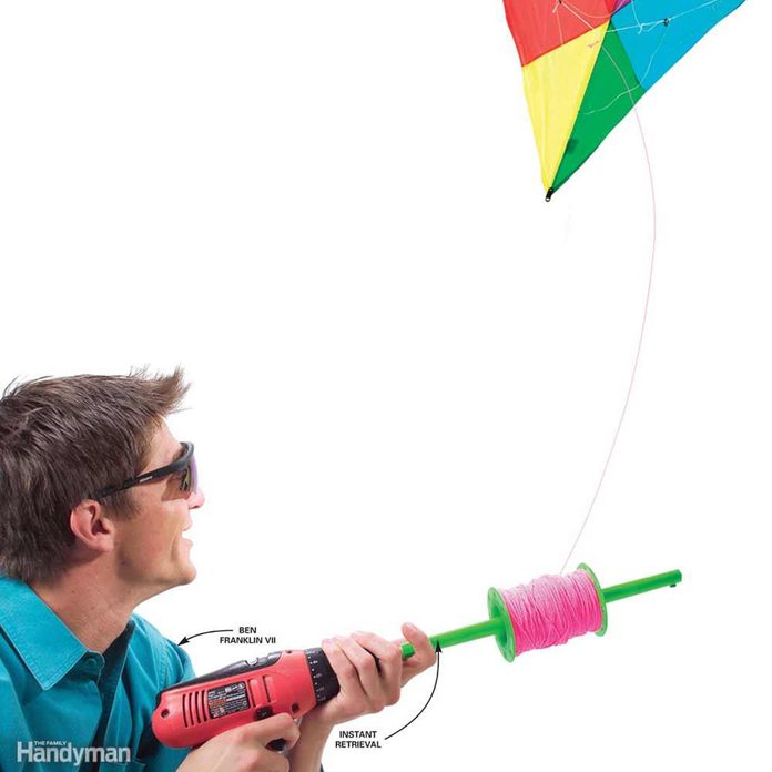 Does it take forever to wind in your high-flying kite? Cut the tips off a plastic kite string spool and screw in a piece of 3/8-in. dowel, leaving a few inches of dowel sticking out. Tighten the end of the dowel in a 3/8-in. cordless drill. That’s it — run the drill to haul in that kite. Once you’re done, find the right place to store it in the garage.