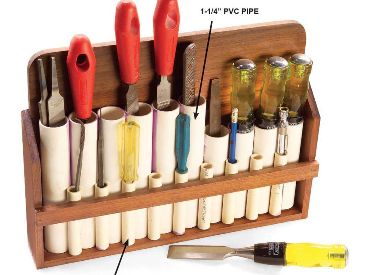 Saw off short pieces of 1-1/2-, 2- or 3-in. PVC plumbing pipe with 45-degree angles on one end. Screw them to a board to hold paint brushes, pencils, stir sticks and just about any other narrow paraphernalia in your shop. Mount them by drilling a 1/4-in. hole in the angled end, and then drive a 1-5/8-in. drywall screw through the hole into the board.