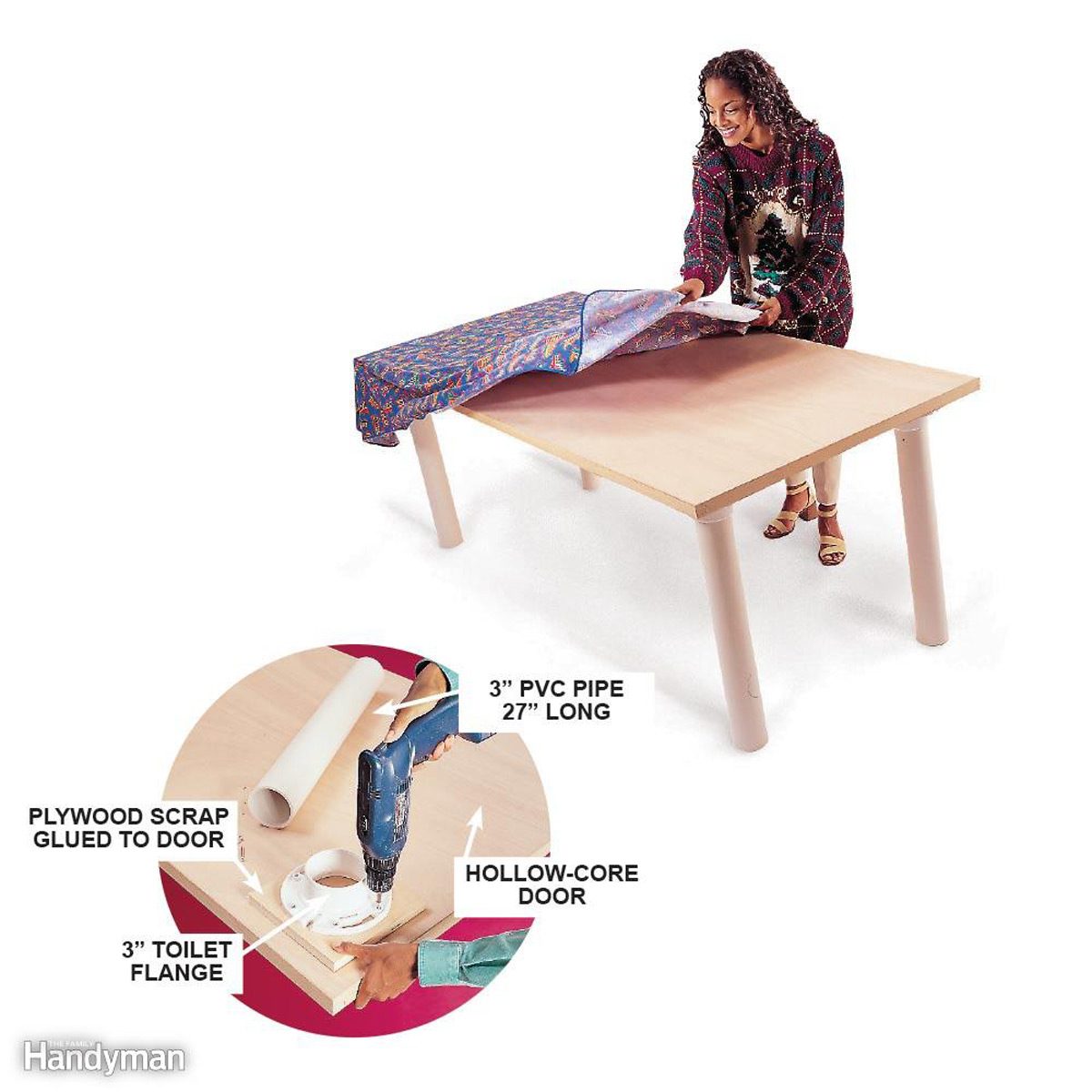 Aunt Edna just called to tell you she’s coming for the holidays (and bringing some nice people she met hanging around the bus station). Trouble is, you don’t have enough table space. Don’t worry; just run to the home center and get a 10-ft. length of 3-in. PVC pipe, four 3-in. toilet flanges and a hollow-core door. Hollow-core ‘slabs’ are 80 in. long and available from 28 to 36 in. wide. Cut the PVC to make legs and assemble the table as shown. And then check out our tips for finishing a table top. It’s not a masterpiece, but under a tablecloth it looks fine. Plus it’s light-weight and easy to disassemble and store until next year. Just remember that hollow-core doors aren’t very strong so don’t sit or stand on the table.