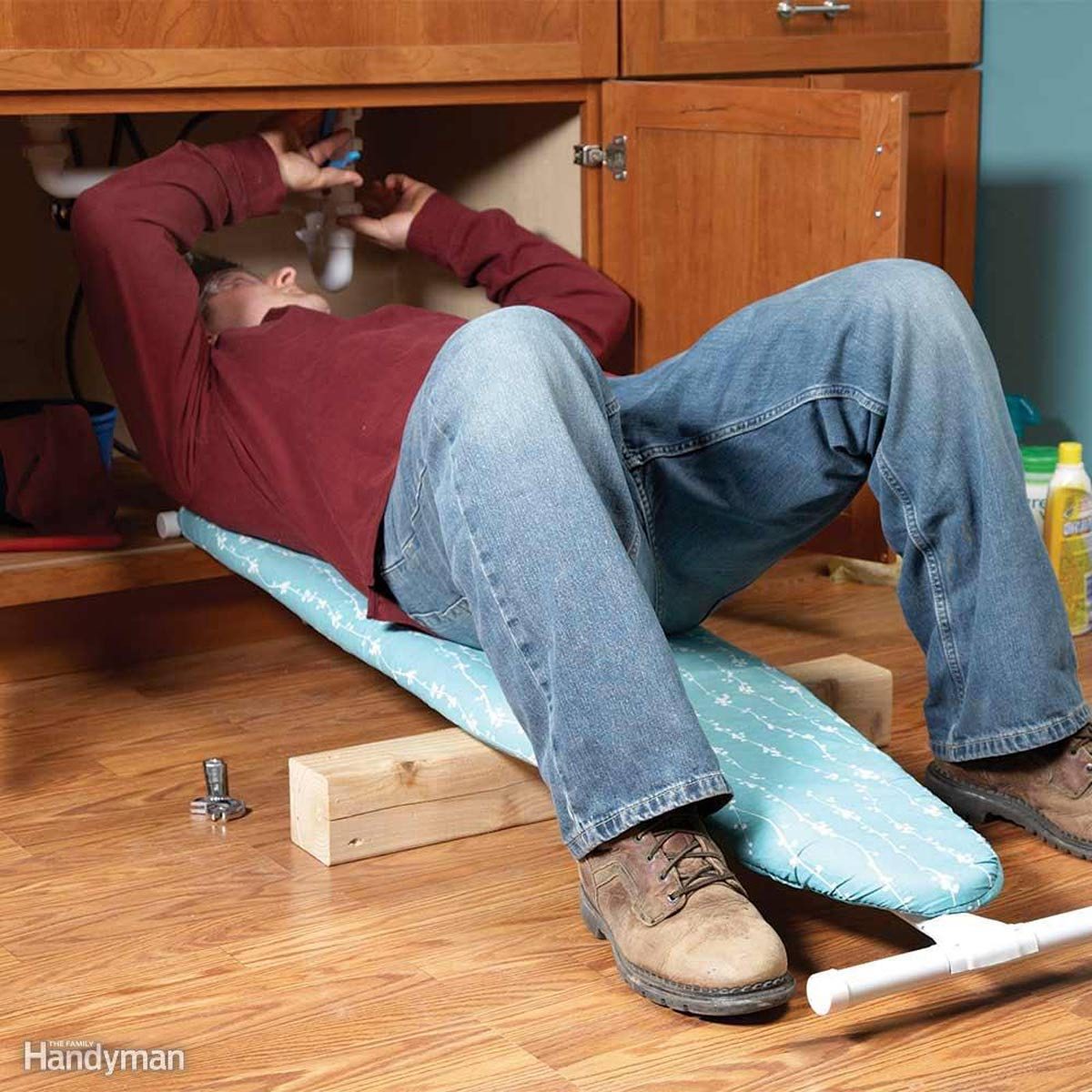Working under the sink on your back isn’t exactly comfortable, especially when the sharp cabinet edge cuts into your shoulder blades. Make it more comfortable by lying on an ironing board. Set one end of the board inside the cabinet and support the other end with a scrap piece of 2×4. It won’t make the repair any easier, but it’s definitely easier on your back.