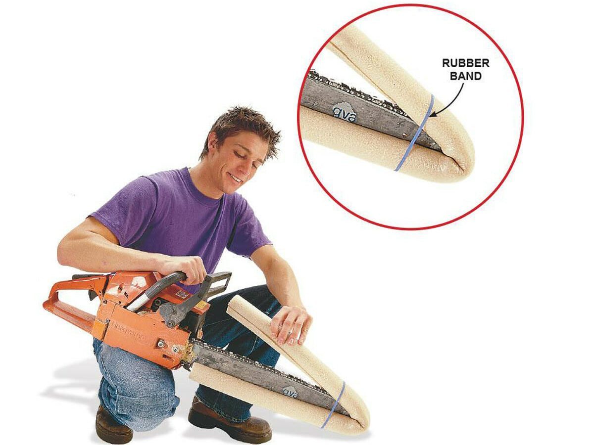 Protect a chain saw blade with 3/4-in. foam pipe insulation. Wrap the insulation around the blade and strap it tight with a couple of rubber bands.