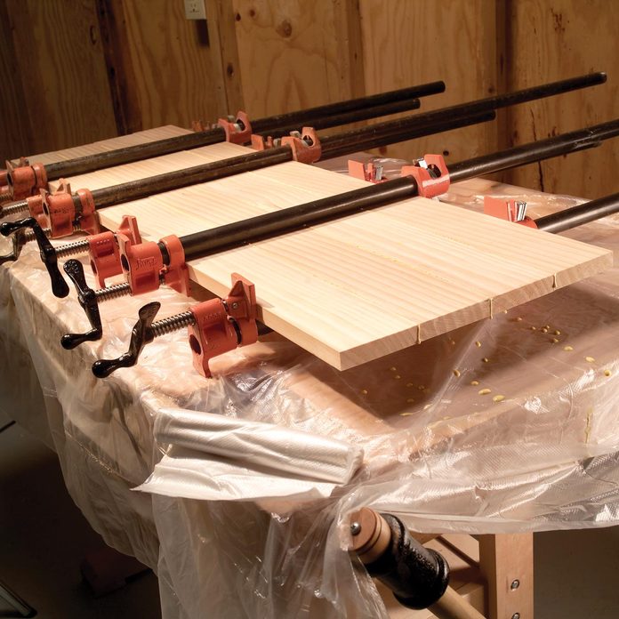 Here’s how to avoid scraping hardened glue off your workbench. Before you set up for gluing, lay a sheet of inexpensive, thin painter’s plastic underneath. Another nifty tip to avoid rockhard glue on your workpiece is to glue it, then wait two hours and scrape off the excess. The glue is still pliable at this stage, so the job is quick and easy.