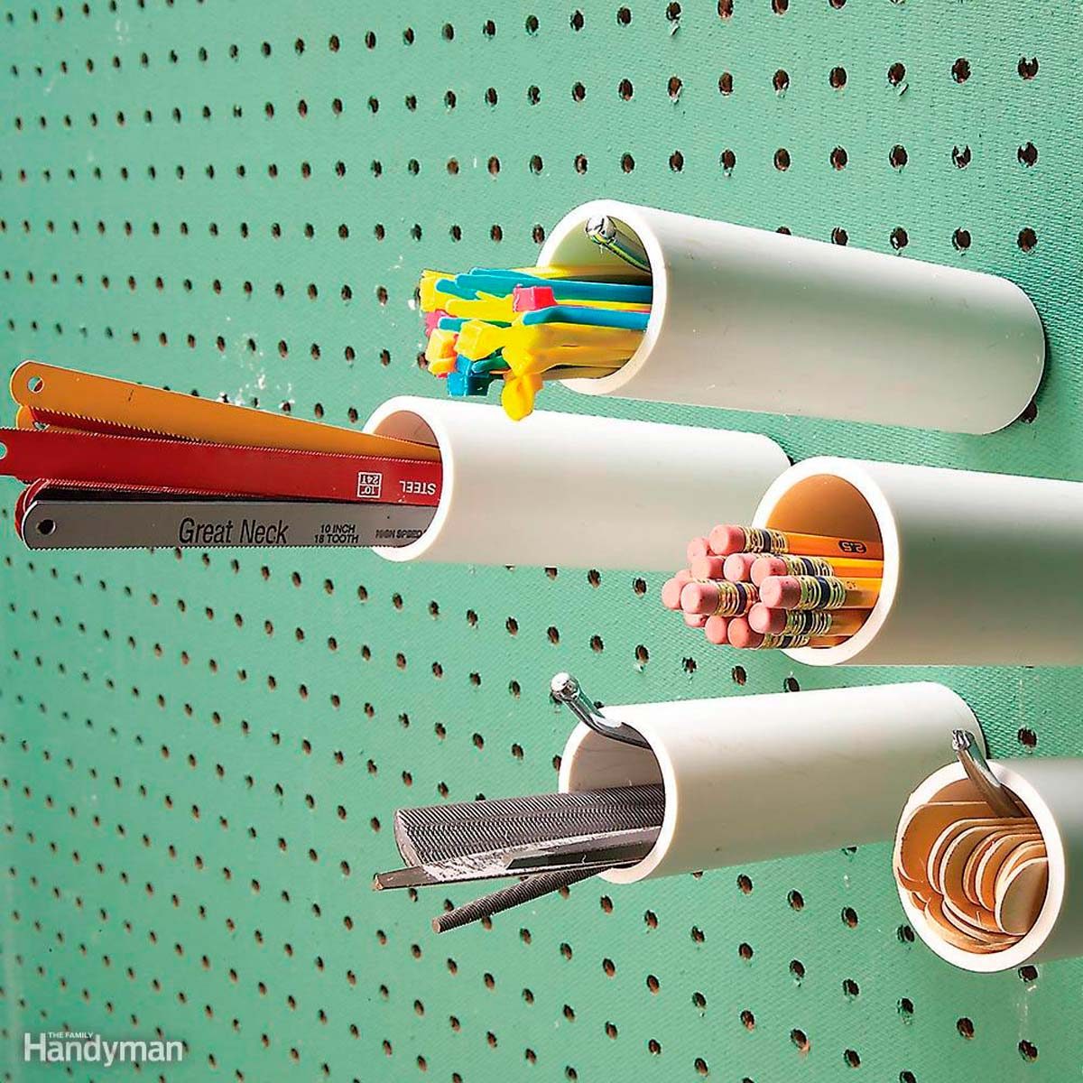 Is the top of your workbench always cluttered with little stuff like pencils, files, zip ties and the like, but when you need one of those things, you can’t find one? Here’s a solution: Cut short lengths of PVC pipe (1-1/2- and 2-in.-diameter pipes work well for most items) and slide them over pegboard hooks. Then load them up with files, hacksaw blades, zip ties, pencils, stir sticks…whatever!