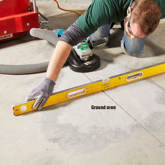 Start grinding the concrete on the crown of the high spot and work your way toward your marks. When you feel you’ve made progress, use the straightedge again to check for flatness. Retrace the high spots and grind them down. Repeat this grind-and-check process until the high spot is gone.