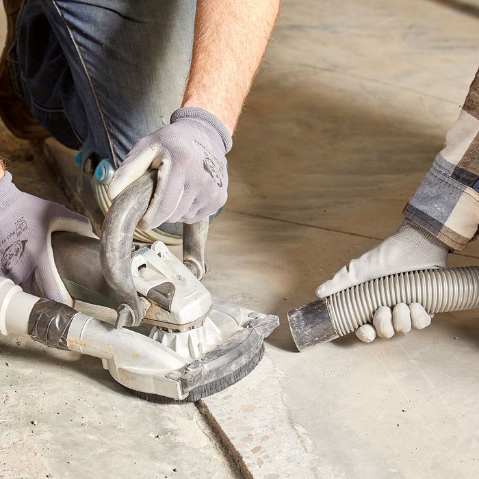Plan to deck yourself out in safety gear: hearing protection, safety glasses and a respirator. The high-speed machines are loud and can send concrete rubble flying from the grinding wheel. Grinding concrete also releases fine silica dust, which can cause health problems. Always wear a NIOSH-certified N95-rated respirator. Check the seal with this easy test: If you can exhale and inhale sharply without air escaping, you’re good to grind. If you have facial hair, even a bit of stubble will ruin the seal. Go ahead and shave—it will grow back!