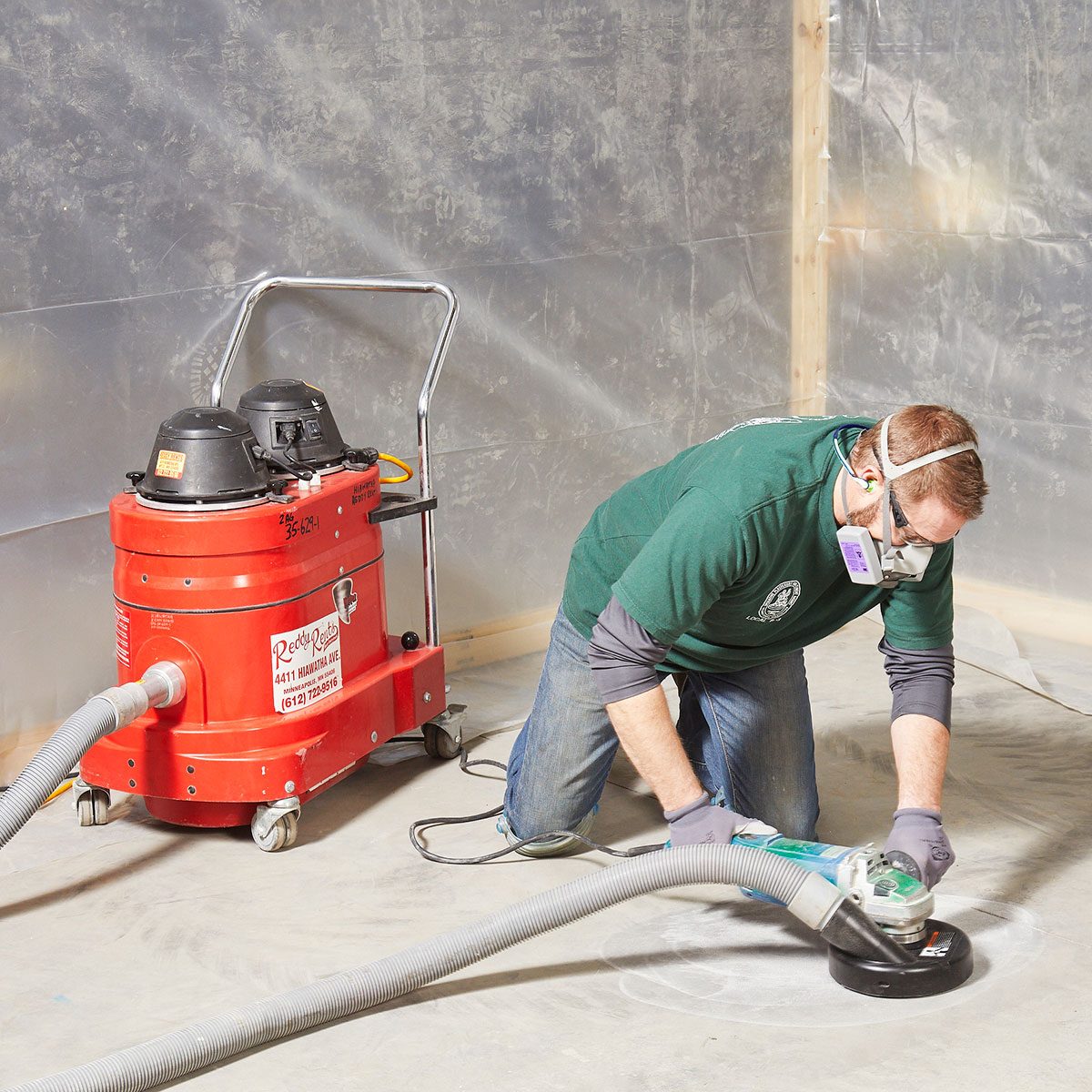 There are two great ways to keep the dust from going wild. You can use a hand-pump sprayer to soak the floor with water as you grind to keep the dust down. But you’ll have a messy slurry that will need to be hosed away or sucked up with a wet vacuum.
