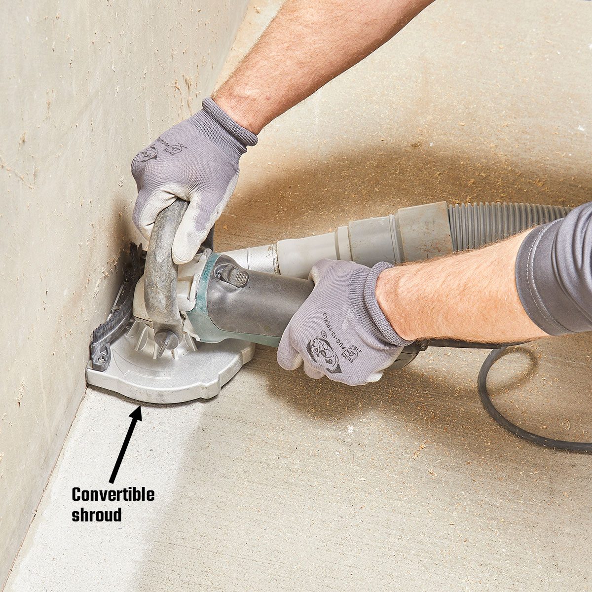 Never remove a dust shroud to get close to a wall. You’ll increase your exposure to nasty silica and remove a safety barrier. To grind near walls with a convertible dust shroud attached, push the open end of the dust shroud against the wall and make steady, shallow passes. Be sure you don’t dig the edge of the wheel into the concrete as you move it back and forth.