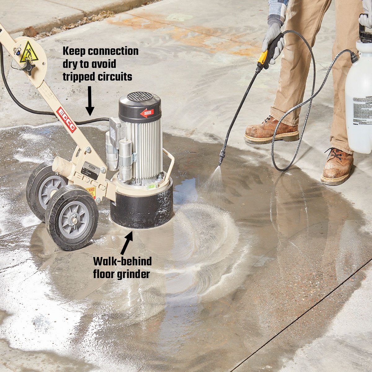 Plan to deck yourself out in safety gear: hearing protection, safety glasses and a respirator. The high-speed machines are loud and can send concrete rubble flying from the grinding wheel. Grinding concrete also releases fine silica dust, which can cause health problems. Always wear a NIOSH-certified N95-rated respirator. Check the seal with this easy test: If you can exhale and inhale sharply without air escaping, you’re good to grind. If you have facial hair, even a bit of stubble will ruin the seal. Go ahead and shave—it will grow back!