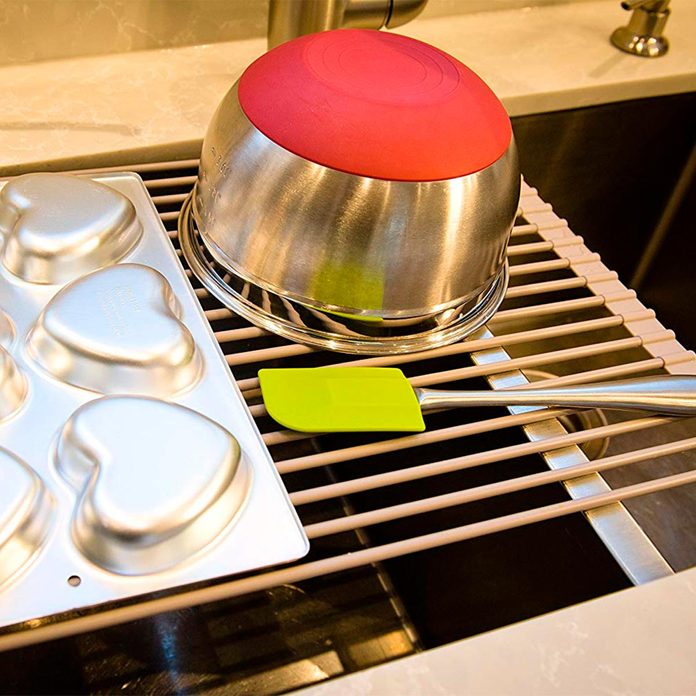 If you like each type of dish you wash to have it’s designated spot to dry, check out this two-tier kitchen dish drying rack and storage system. Made with heavy-duty and rust-resistant chromed wire, it’s designed to hold plates on the top tier, while the flat bottom rack can be used for mugs and bowls. One side is even equipped with a cup drainer and the other side has a cutlery drying basket. Check out these 7 dishwashing mistakes you’re making.
