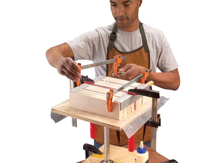 Ever scratched your head over how to position clamps on a project that requires clamping from all four sides? This gluing pedestal makes the job a breeze. Buy a 12-in. pipe nipple with pipe flanges on both ends and screw it to a couple of scraps of 3/4-in. plywood. Cut the pedestal top an inch or so bigger than the project to make clamping easier. Now, with the base of the pedestal clamped on your workbench, you can crank on the clamps from every angle; up, down and sideways. (Be sure to cover the top with plastic sheeting or wax paper, or the top will become a permanent part of the project.) Thanks to Travis Larson for this high-flying tip.