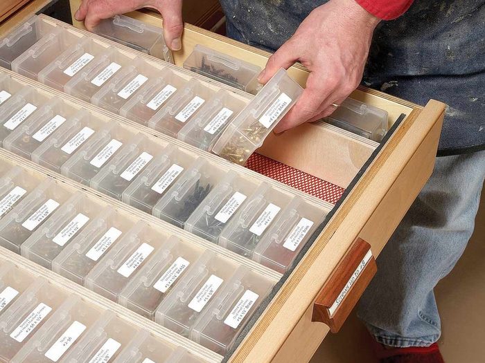 In this drawer, movable partitions are held in place by strips of foam weather stripping at the front and back. The 44-plus boxes rest on edge, labels up, for easy grabbing and stowing. Think of never having to wonder where to find a 1-in. drywall screw or a 3/8-in. washer!