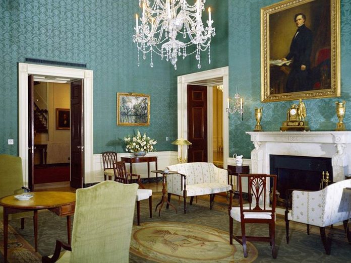 The Red Room was almost completely designed in a French style. Revamps included pinkish-red silk upholstery for the wall. The room held a gueridon, a small table with a circle top that is supported by columns or by human sculptures or mythological figures. There are sofas that belonged to Dolley Madison and George Washington’s granddaughter, Nelly Custis. Jackie brought in a French empire chair that was in White House storage and carpet woven in France was donated after Andre Meyer funded it in exchange for a meeting with Jackie. A French chandelier from 1820, French bouillotte table lamps and French torch lamps were also brought in. Window treatments of straight panels of cerise silk suspended from a gilded wood rod and rings got added, too. Here are ideas to update your window treatments.