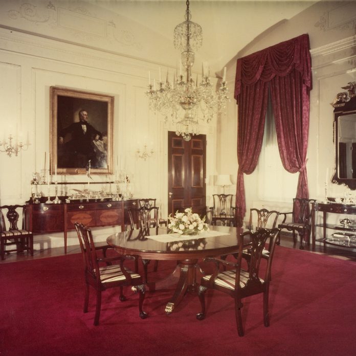 Federal-style antiques furnished the room and the family sat at a Sheraton pedestal dining table. They ate with silverware purchased by Andrew Jackson in 1833.