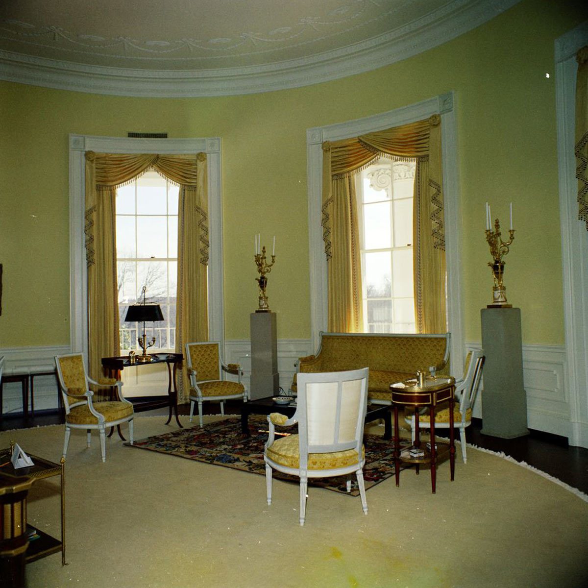 While the Kennedys were in the White House it was used as a drawing room. Jackie had it painting a soft yellow and brought in a pale yellow oval carpet. Oriental rugs topped the carpet. Sister Parish designed the room initially and then Boudin added some touches to it. Boudin replaced the furniture with French antiques from the 18th and 19th centuries in the Louis XVI style. Two green marble columns were made to hold antique, electrified candelabras.