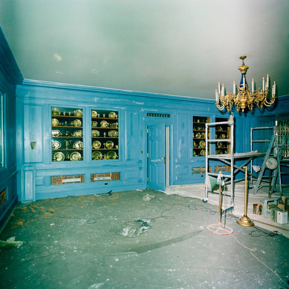 The Vermeil Room in the White House holds the vermeil along portraits of First Ladies and while Jackie was First Lady she used it to display flowers and fruit. This picture shows the room as a work in progress in 1963. Boudin scrubbed down the walls with wire brushes to bring up the grain of the wood and create an aged look. He painted it off-white and added a coating of blue paint. The shelves were the vermeil were displayed were covered with white velvet and a neoclassical Caryatid mantel was installed. That mantle is still in place. White damask drapes with blue and off-white fringe trim were added and blue and white patterned carpet was chosen. The room also got a gilded chandelier and became more of a gallery room.