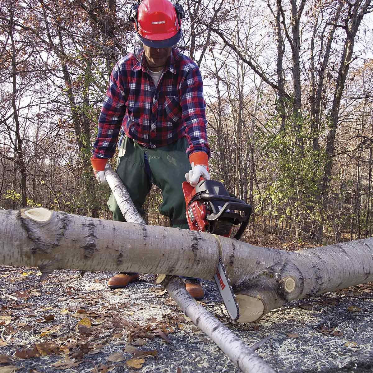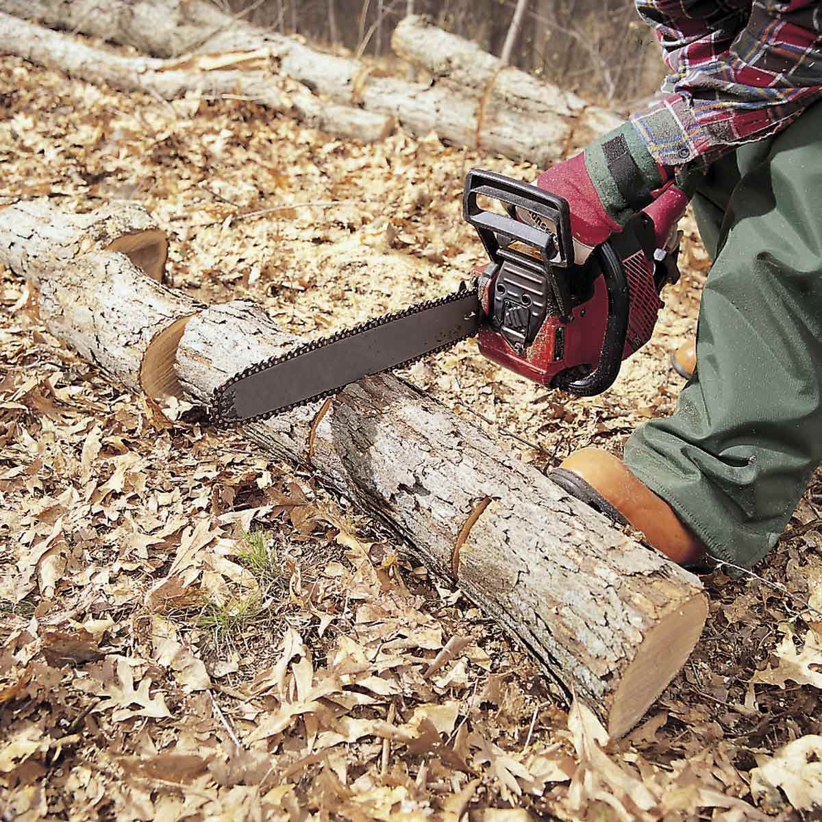 When cutting up a felled tree, avoid touching the ground with the chain because even a brief encounter will severely dull the cutting teeth on your chain saw. If possible, cut partially through the tree and then rotate it to cut the rest of the way through.