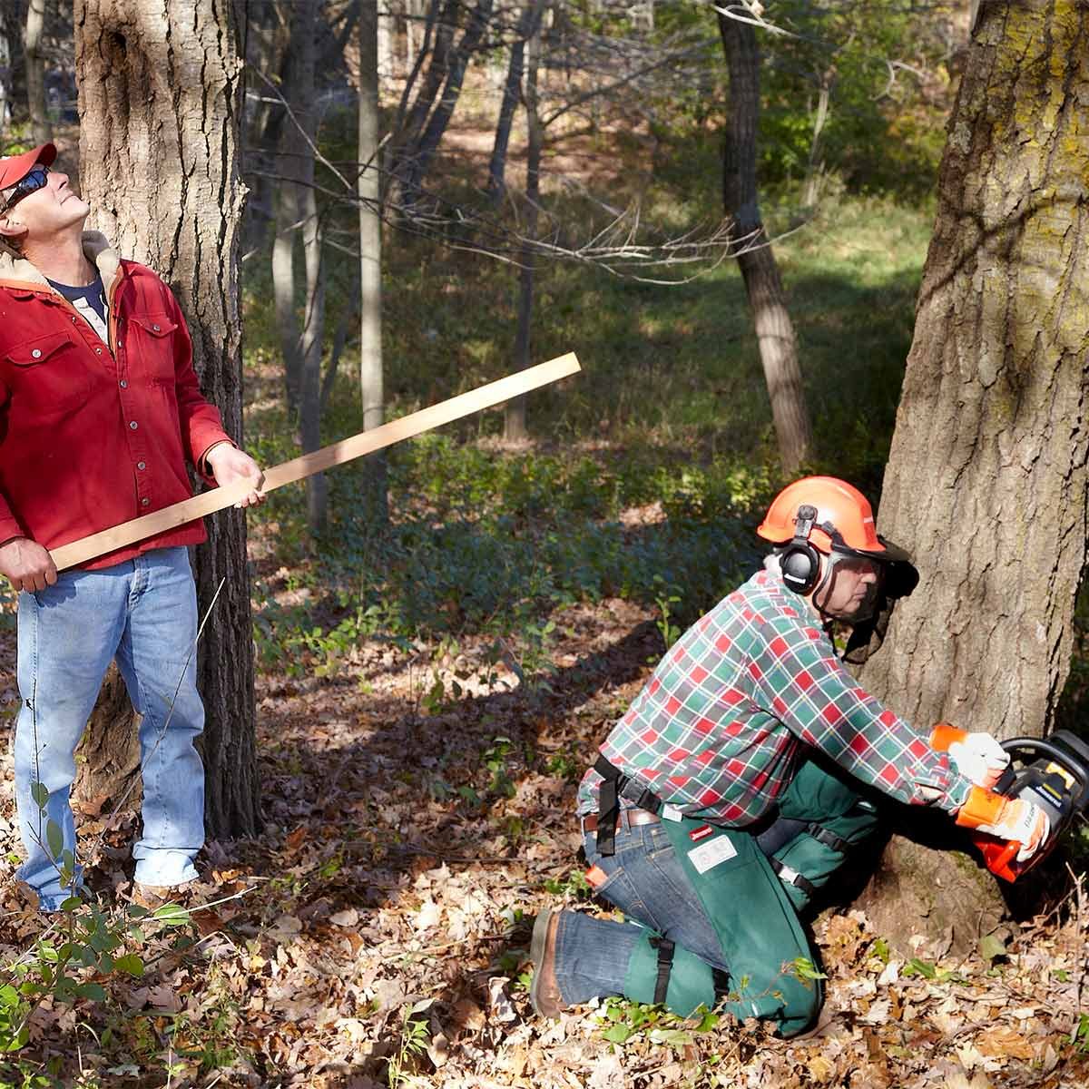 You’ll be a lot safer if you have a trusted assistant standing a few feet behind you, watching the top of the tree for falling branches and letting you know when the tree starts to fall. Have your assistant tap you on the shoulder with a stick to alert you when it’s time to vacate the area.