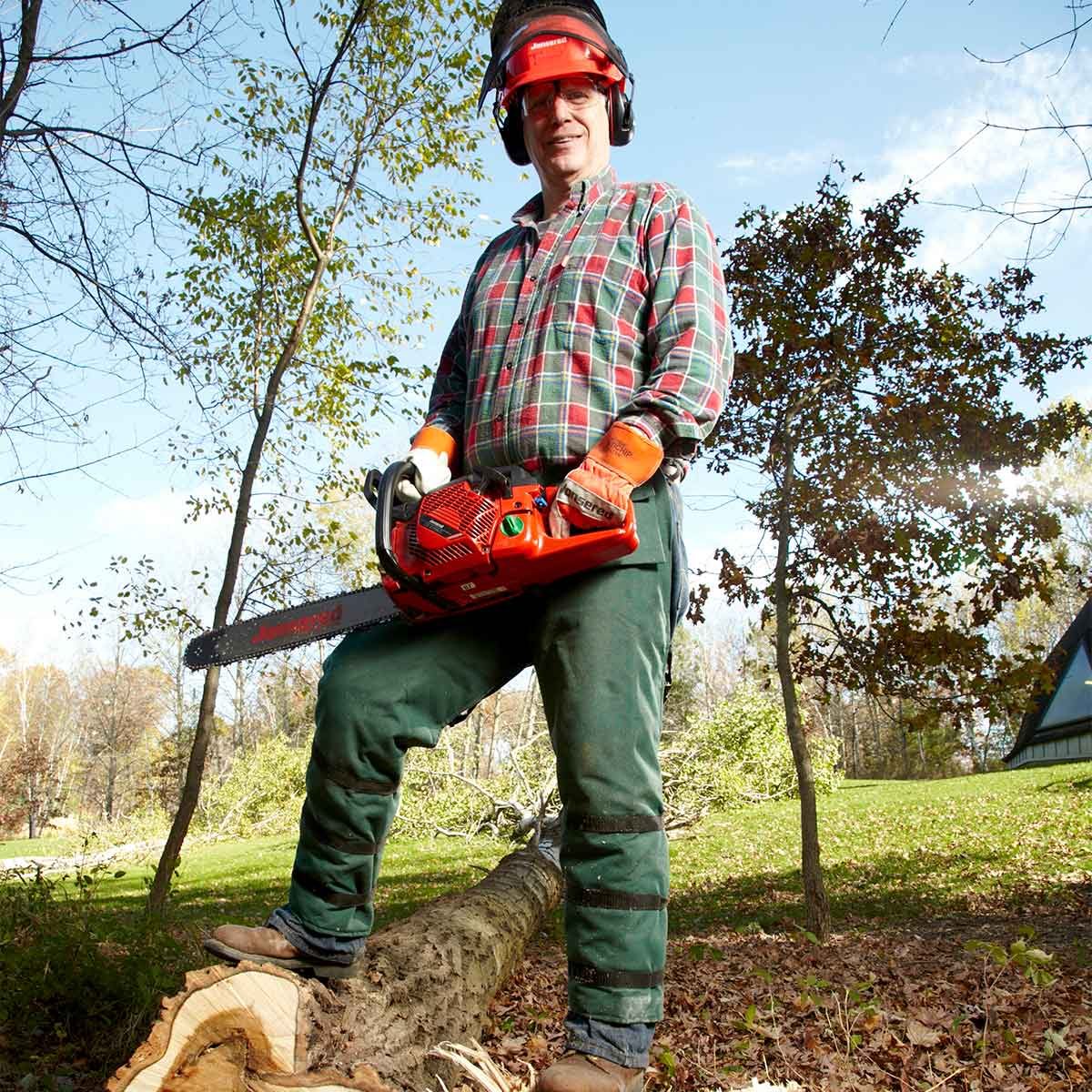 It might be tempting to lean a ladder against a tree to do some pruning. Don’t do it. This stunt accounts for a large percentage of chain saw injuries.