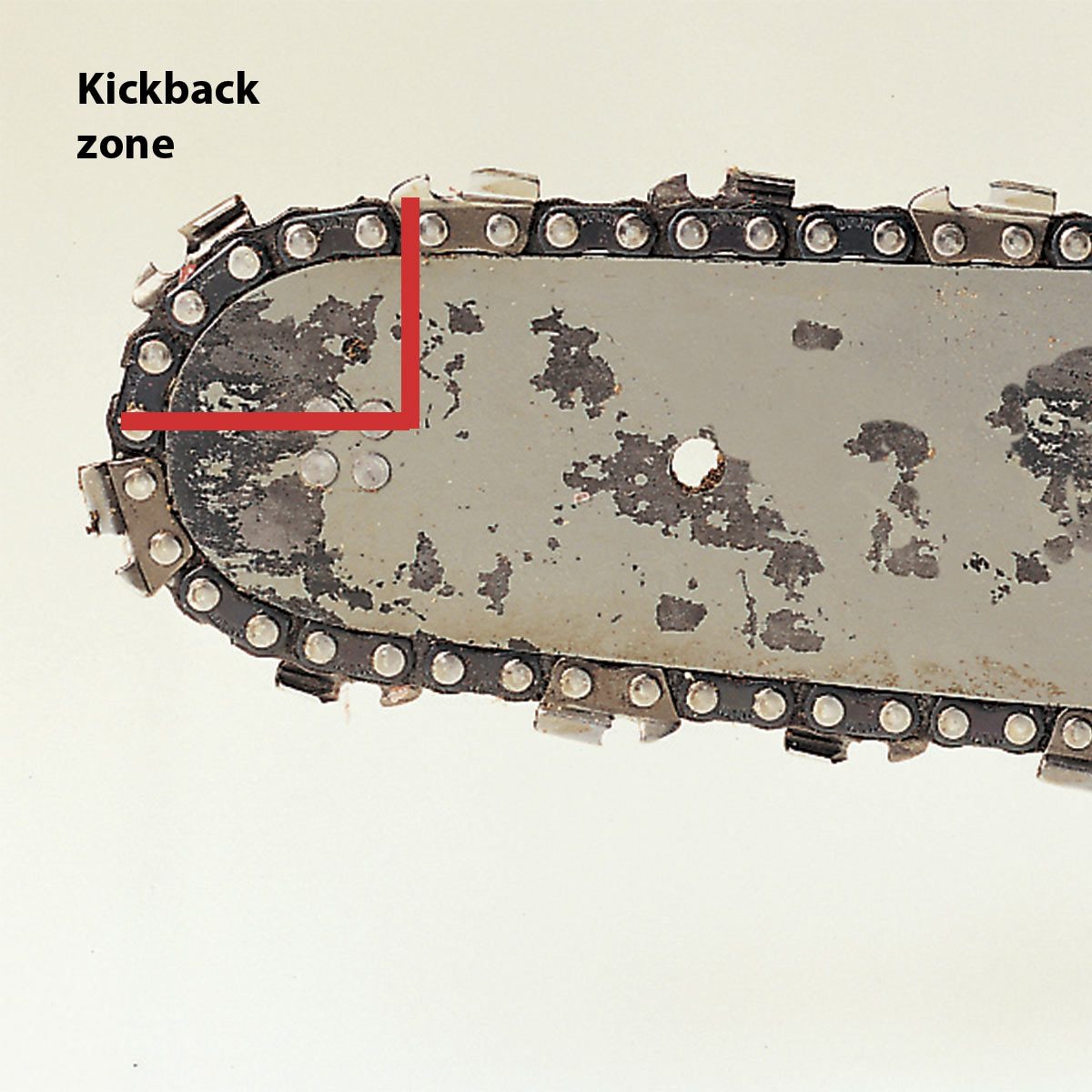 This spot, called the kickback zone, is the top half of the bar’s tip. If the kickback zone comes in contact with something while the chain is moving, the saw will kick up and back toward you. That’s why modern chain saws are equipped with a chain brake designed to stop the chain if a kickback occurs.
