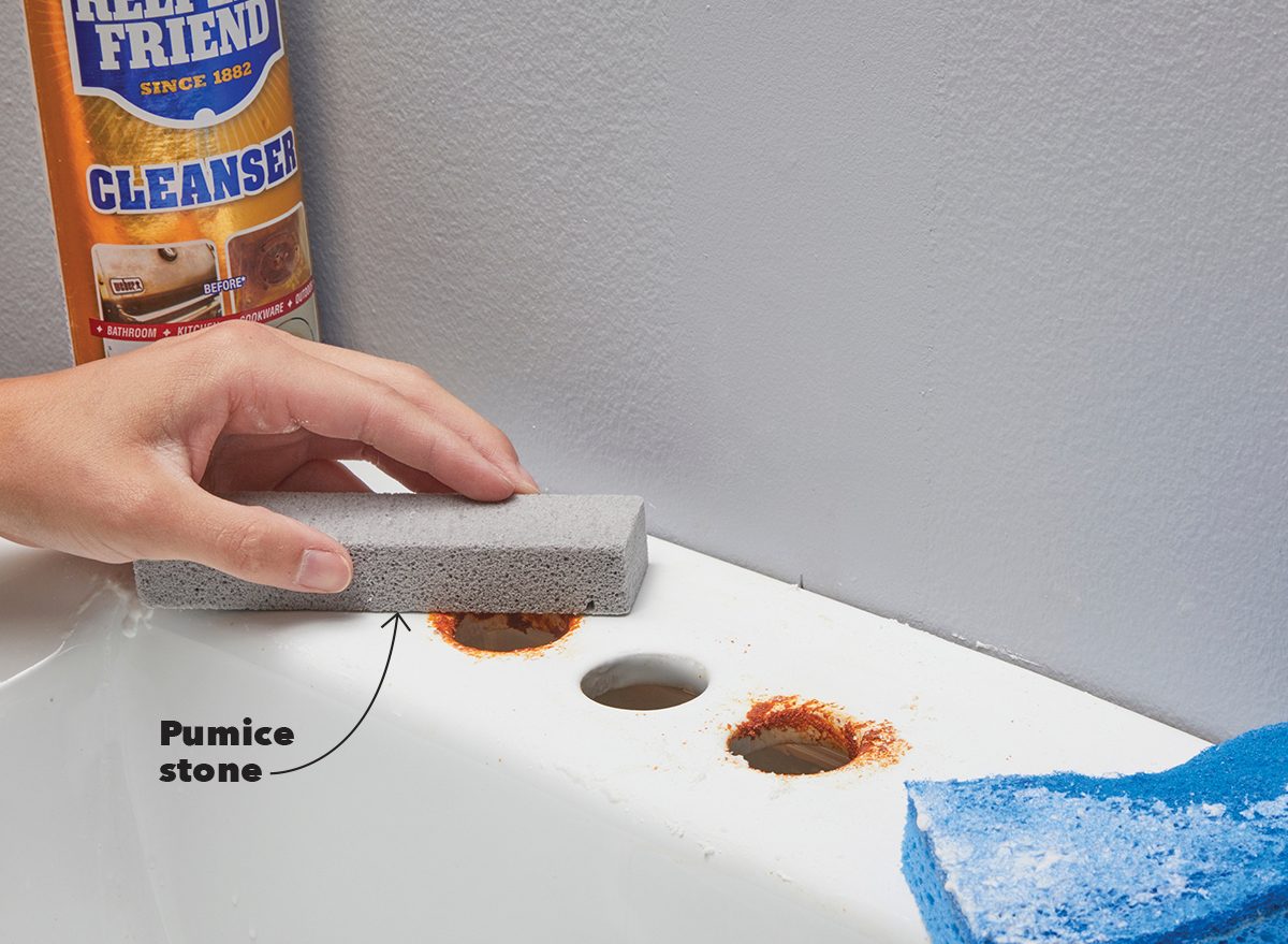 To ensure a good seal between the sink and the new faucet, be sure to clean up the footprint of the old faucet. Scouring powder works well for soap scum and crud. For tougher lime or rust deposits, a pumice stone is the best remedy.