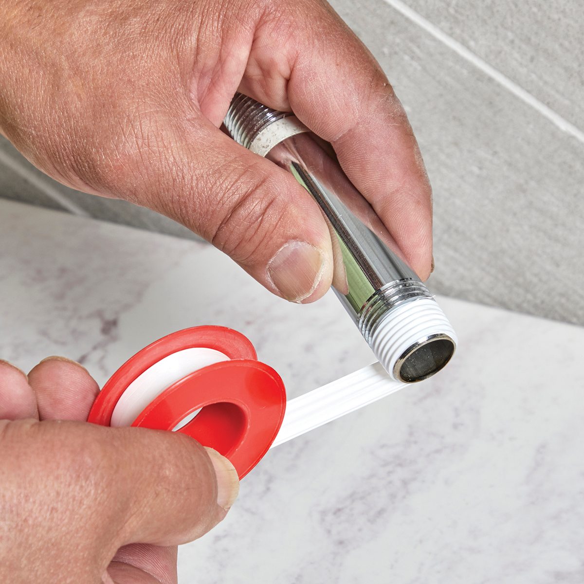 A 40-ft. roll of Teflon tape costs about a buck, so don’t be stingy with it. Make sure you wrap all your threaded connections clockwise several times. When you thread on that nut, it should feel tight, and the clockwise wrap will keep the tape from unraveling as you tighten the connection. Joe also wraps the threads for supply hoses even though they have a self-sealing rubber washer. Teflon tape is just more cheap insurance against any leaks, so don’t skimp.
