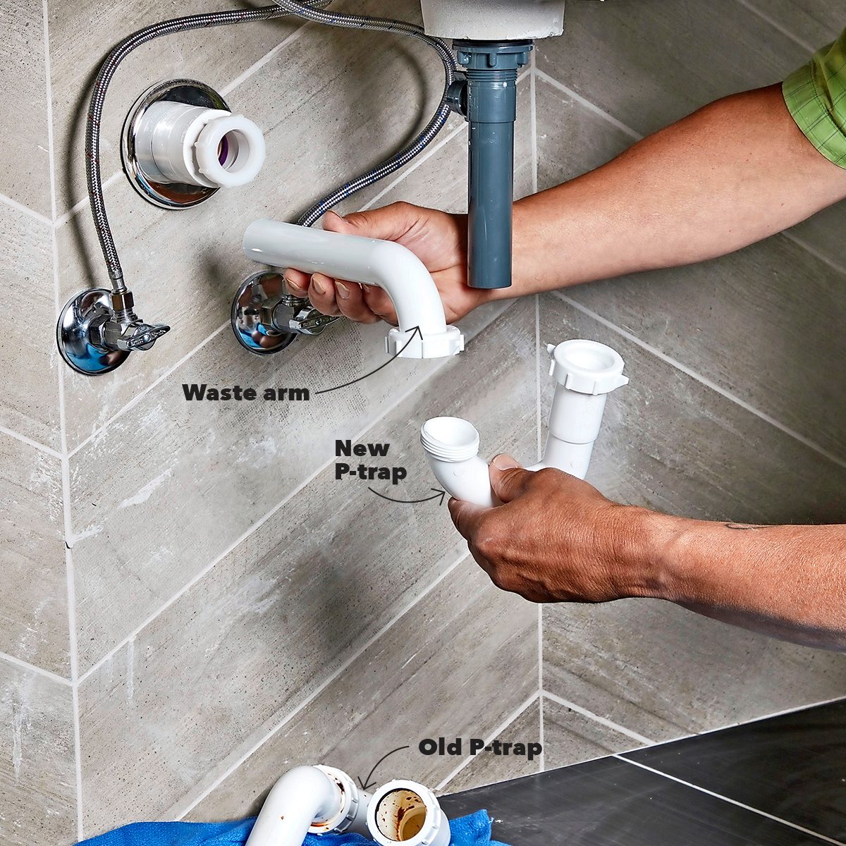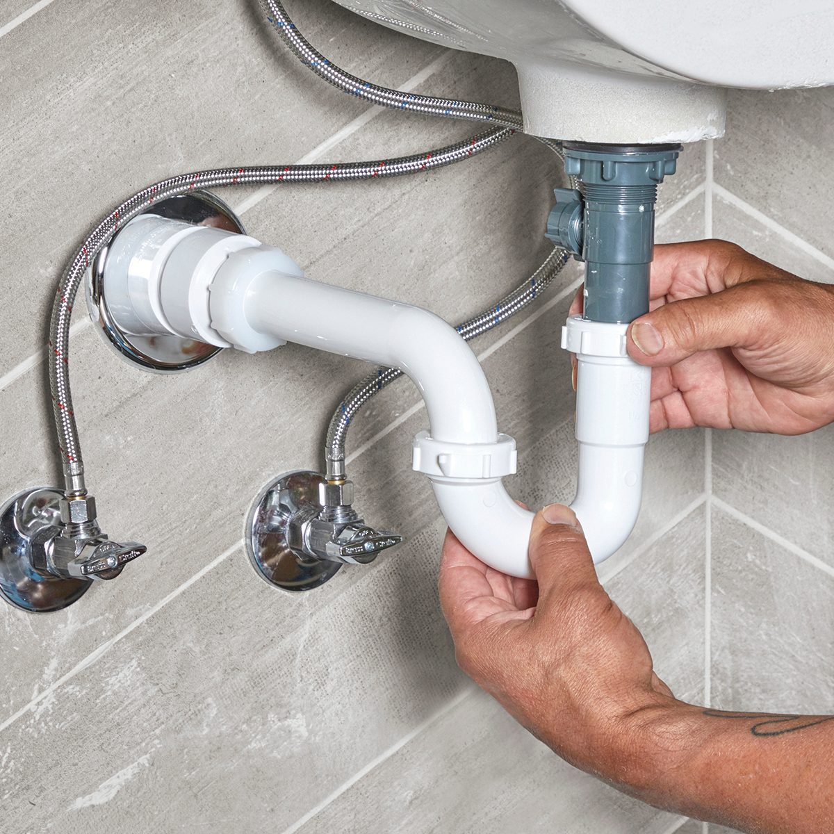 Make space under the sink by taking out the P-trap. Reusing an old P-trap can be a messy ordeal, so Joe usually includes a new trap assembly on his installs. The cost of a plastic P-trap kit is less than $5, and you’ll get peace of mind knowing all those fittings are new and clean. Keep in mind that most bath sink drains are 1-1/4 in., and kitchen sink drains 1-1/2 in. Joe sees a new P-trap as cheap insurance against callbacks.