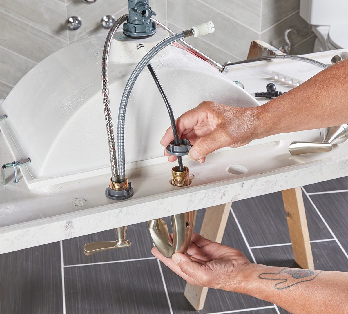 If you’re installing a new sink, mount the faucet to the sink before dropping the sink into place. Having everything in plain view always makes for better connections — and the less time you spend on your back under that sink, the better.