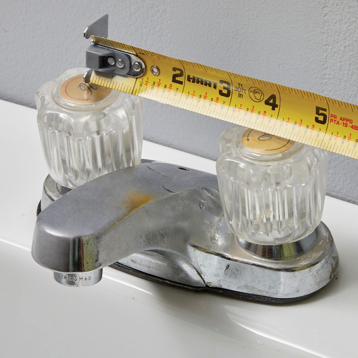 Before you choose a new faucet, check the configuration and spacing on your sink. If you have a three-hole configuration, measure from the center of each handle to determine your spacing. Standard spacing is typically 4 or 8 in. If you want a single-hole faucet but your sink includes three holes, no problem. Many faucets include a cover plate to conceal the other two holes.