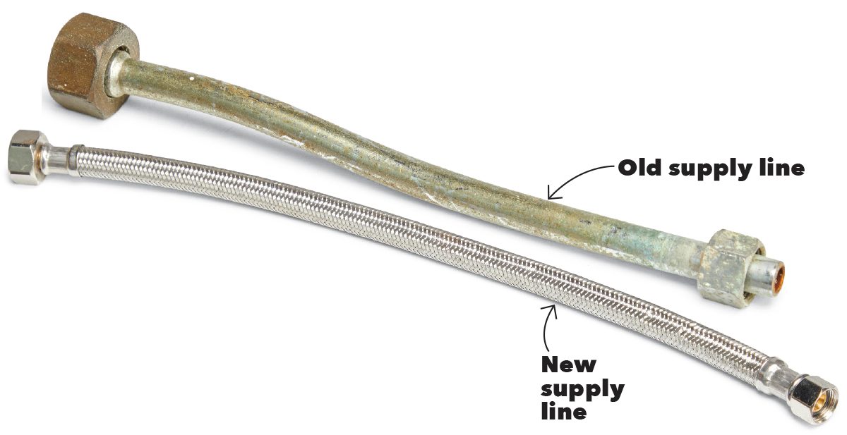 Never reuse old supply lines. The last thing you want is water damage from a failed supply line. Even if the hoses are newer looking, Joe will replace them because the rubber washers can fail over time. Quality supply lines with a braided stainless steel casing may cost a bit more (about $8 each), but they’re well worth it.