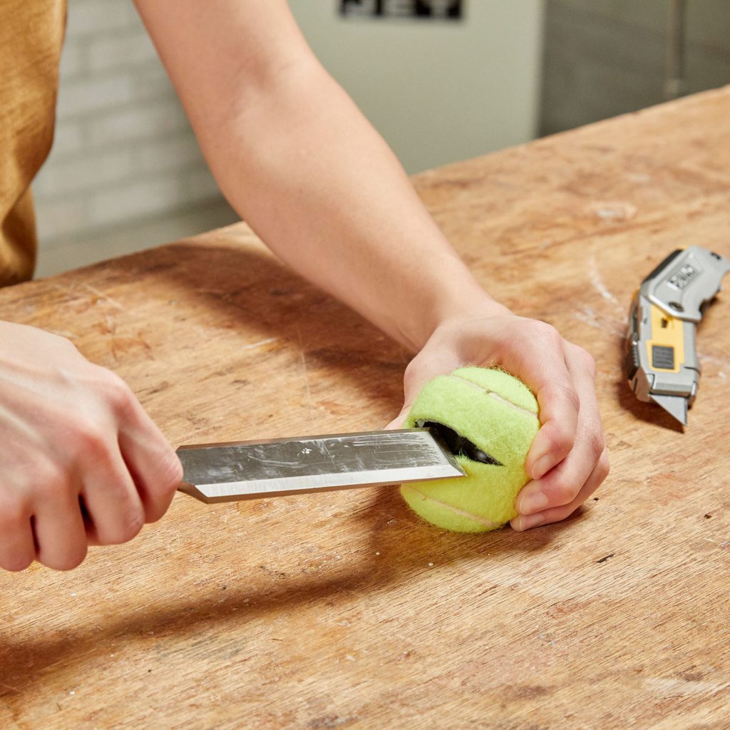 Keep chisels sharp while protecting your hands by covering the tips with tennis balls. Just cut a slit in the tennis ball, slide it over the sharp tip of the chisel, and you’re good to go. The tennis ball will take up more space in your tool bag or bucket, but your hands will thank you.