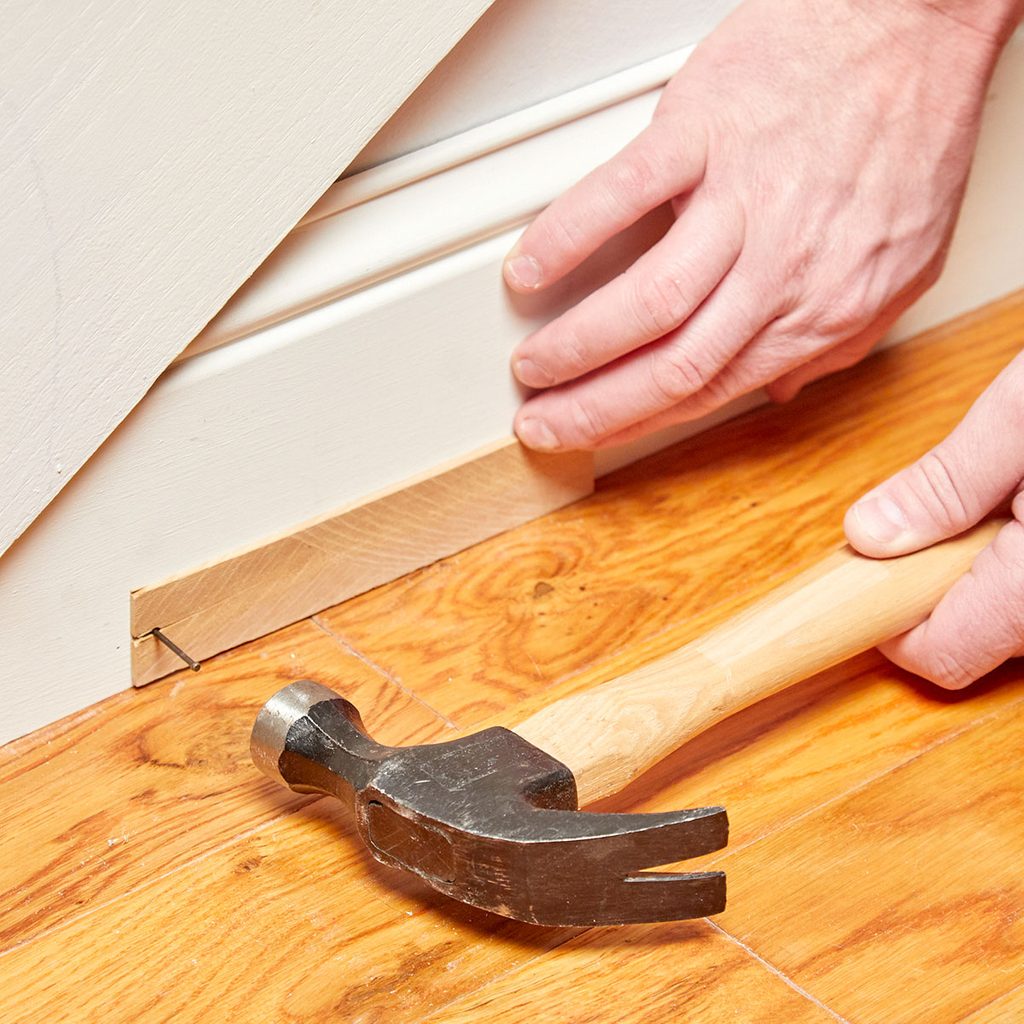 Prevent dings in finished product by cutting a slight kerf into a shim (a bandsaw works really well for this), then slipping the shim around the nail as you hammer it in. The shim will hold your nail in place while shielding it from off-target hits, keeping the area mark-free.