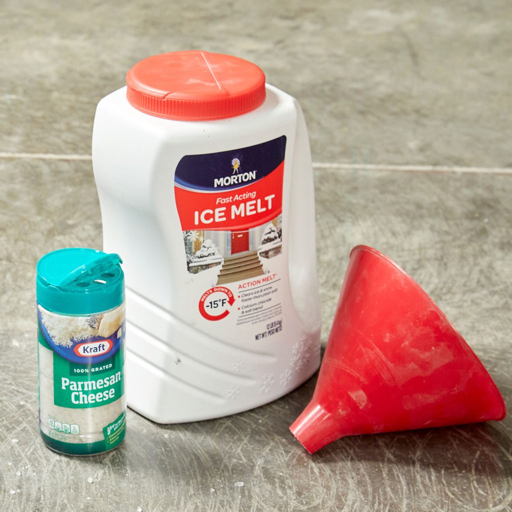 Nobody wants to lug big bags and buckets of de-icer around. Luckily, leftover parmesan cheese cans work great as an easy container and dispenser for de-icers and salts. They’re especially good for targeting small areas.