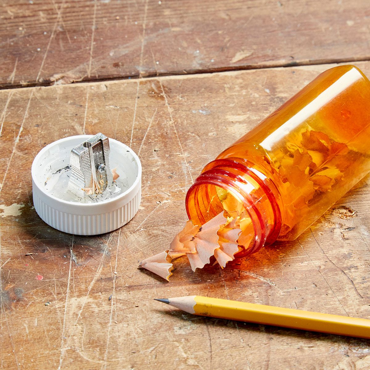 If you don’t have a great mechanical pencil, you’ll have to sharpen some. Small, standalone pencil sharpeners are convenient but leave shavings to clean up. Create a catchall for shavings by drilling a hole in the lid of a pill bottle, gluing the sharpener to it, then screwing the lid back on the bottle.