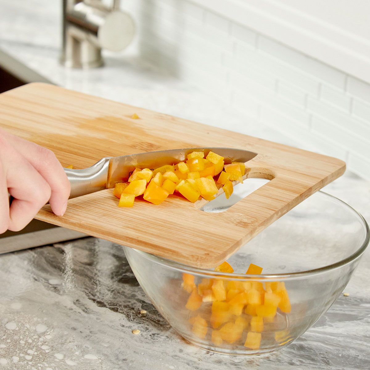 Avoid spilling produce by funneling chopped-up food through the handle of a cutting board into a bowl below. Be sure to position the handle-hole over your bowl and push your chopped-up produce into it.