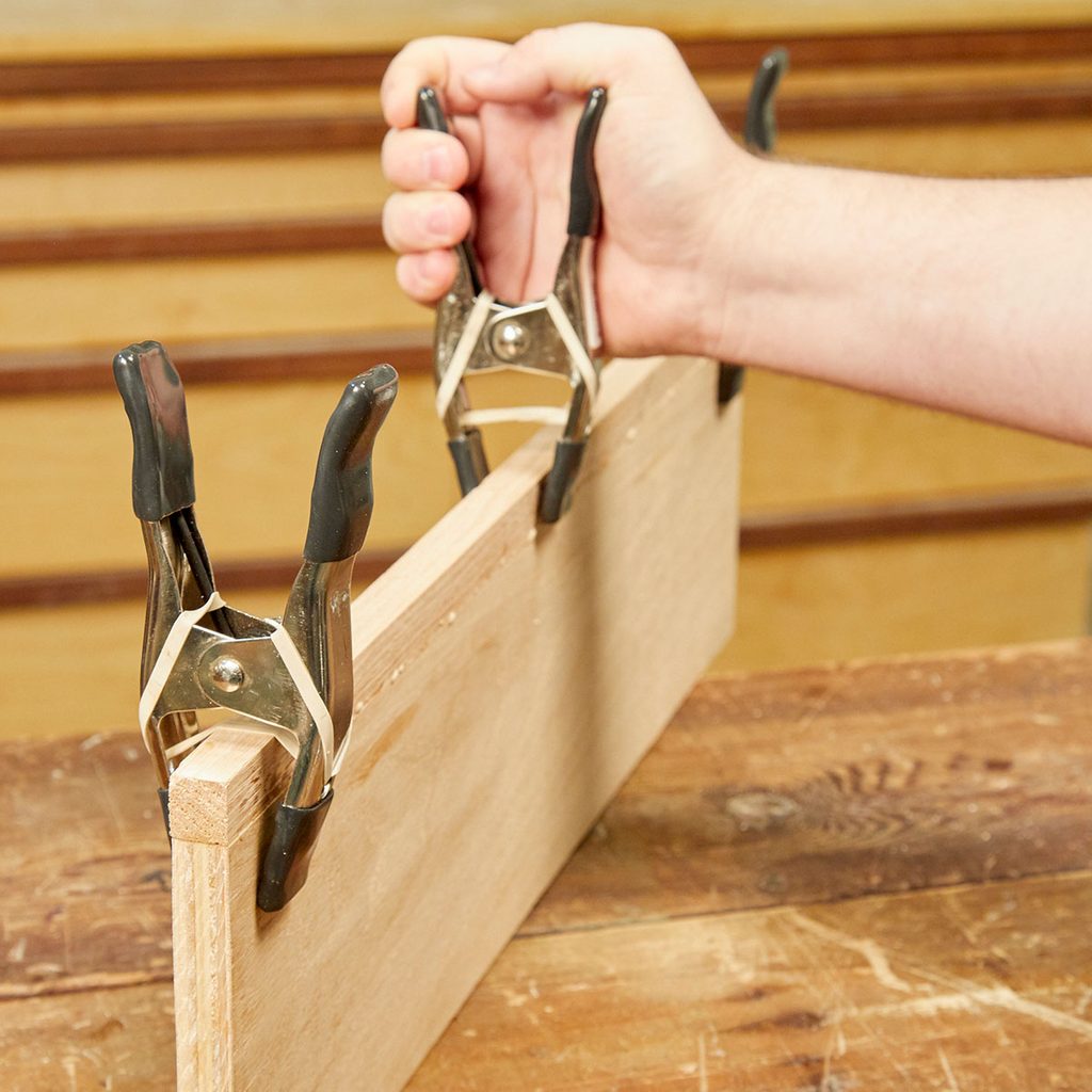 Create a clamp that’s perfect for holding edge materials in place with just a spring clamp and two rubber bands. Slide the ends of the bands through the holes in the sides of the spring clamp. Then loop them around the end of the clamp to hold them in place.