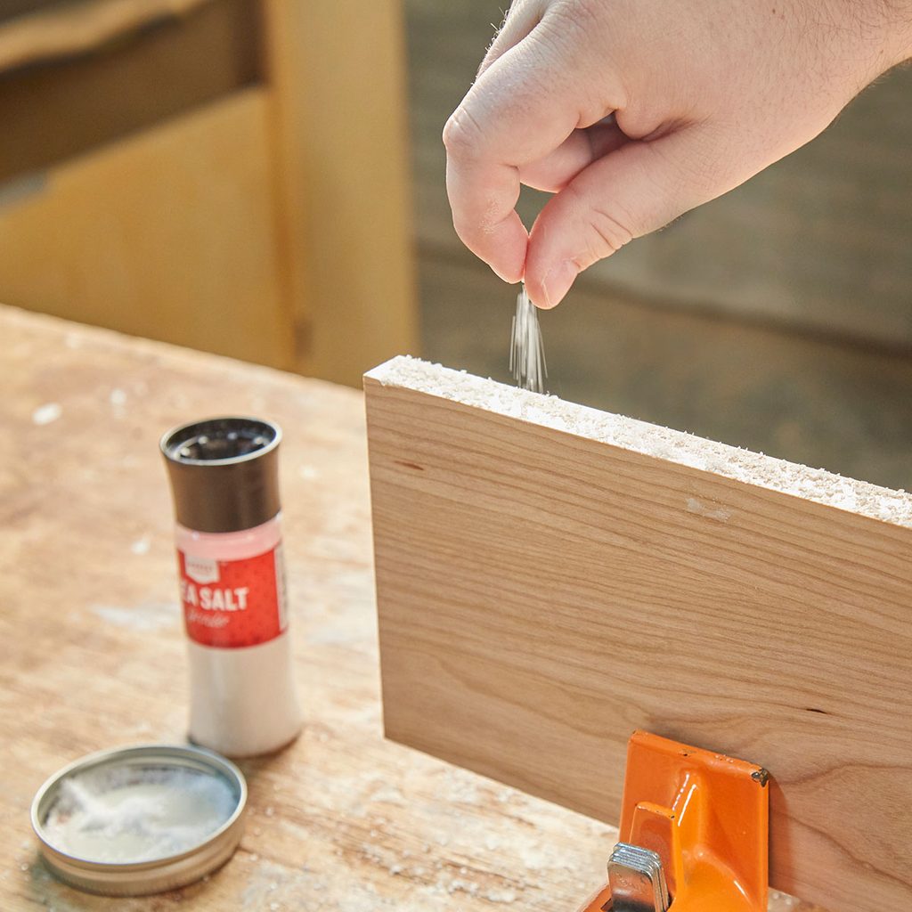 Wood tends to move and shift as though it has a mind of its own. That’s why you should sprinkle a few grains of salt on your glued-up boards before clamping them together. The salt keeps the boards from sliding as you increase clamp pressure.