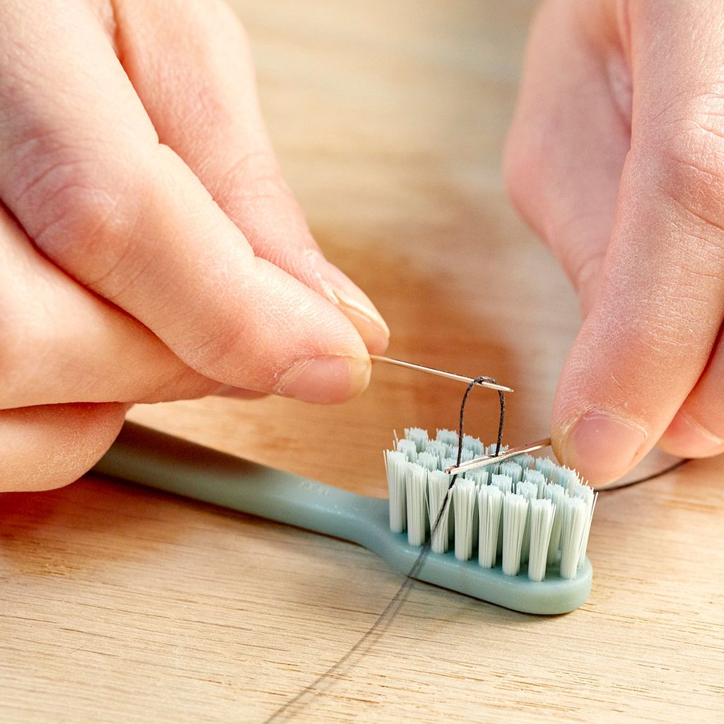 Threading a needle is a tough ask, especially if your hands shake or you can’t see well up close. To make it a little easier, lay the thread across the bristles of an old toothbrush. Press the eye of the needle against the thread until the bristles poke it through, then pull the thread loop up through the eye with another needle.