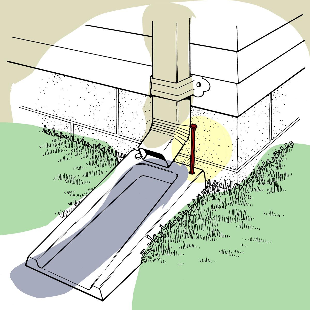 Do those plastic downspout splashblocks tend to wander away from the foundation of your house, allowing water to seep into the basement? To prevent this, drill two holes through the hefty corners of the plastic at the back end. To anchor it, drive two large spikes through the holes into the ground. — Joseph Perrone