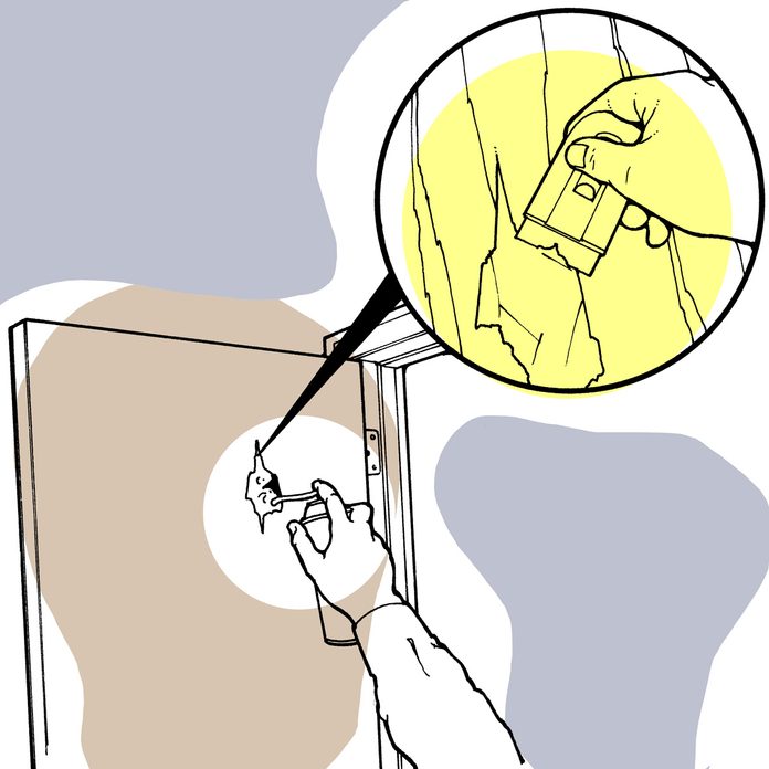 If you have a sizable hole in a painted hollow-core door, here’s a quick way to fix it: Completely fill the hole with spray foam insulation, so the foam is about level with the door surface. Allow it to dry overnight. The foam will expand slightly as it dries, forming a slight mound. Slice off the mound with a razor knife so the foam is slightly lower than the door surface. Apply one or two coats of drywall compound, sand it smooth when dry, and paint. — Richard Loeb Jr.