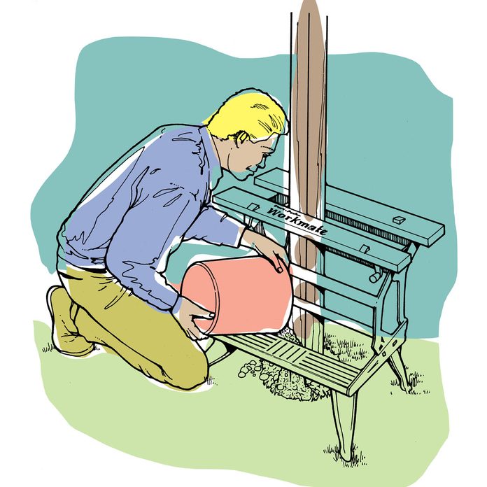 As a novice sinker of fence posts, I was having a heck of a time keeping the post plumb while pouring concrete into the hole. My Workmate workbench saved the day. Here’s the system: Simply position the workbench over the hole, clamp the post in place in the workbench, plumb it, then pour the concrete. By the time you have the next hole dug, the concrete will be firm enough to gently lift the workbench off the post. — Peter Gallagher