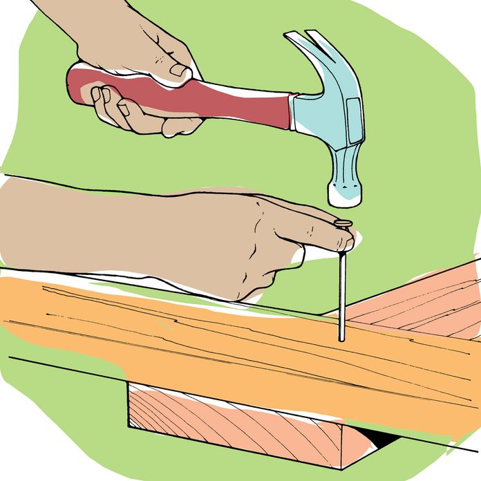 Here’s a way to avoid blue thumbnail misery when you make an occasional bad swing with a hammer: When starting a nail, hold it with your thumb and forefinger right under the head rather than lower down. You’ll be able to keep your eye on your thumb as well as the nailhead, giving you better aim. And if you do make a bad swing, your thumb and finger are more likely to be deflected by the hammer than squashed.