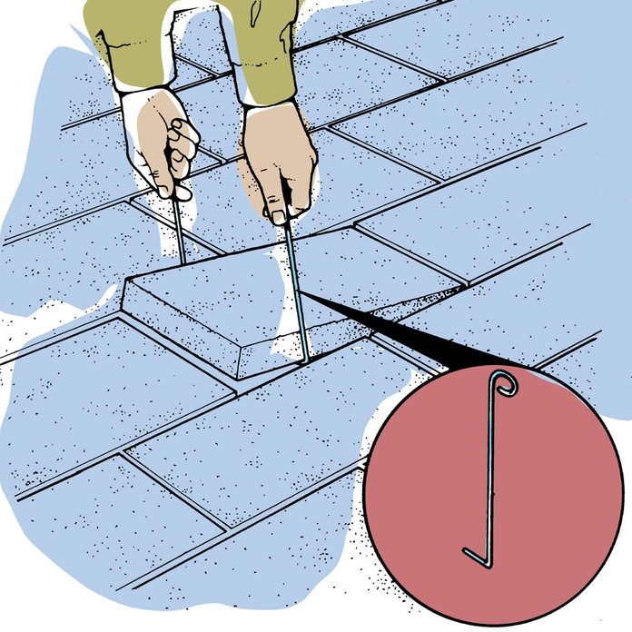 Paver hacks are always a popular topic for our readers. This one is really handy for when you have some individual bricks or pavers in your sand-based patio may need re-leveling after a winter of freezing and thawing. How do you get the brick or paver out? Make these pullers from two pieces of coat-hanger wire. Slip the wires down both sides of the offending paver, turn them a quarter turn, and pull up the paver. For large patio blocks, make four pullers, and get a second person to help.